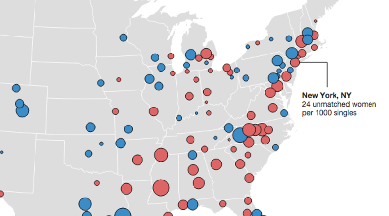 アメリカの大都市に住んでいる独身者の男女比データを基にしたアメリカ地図